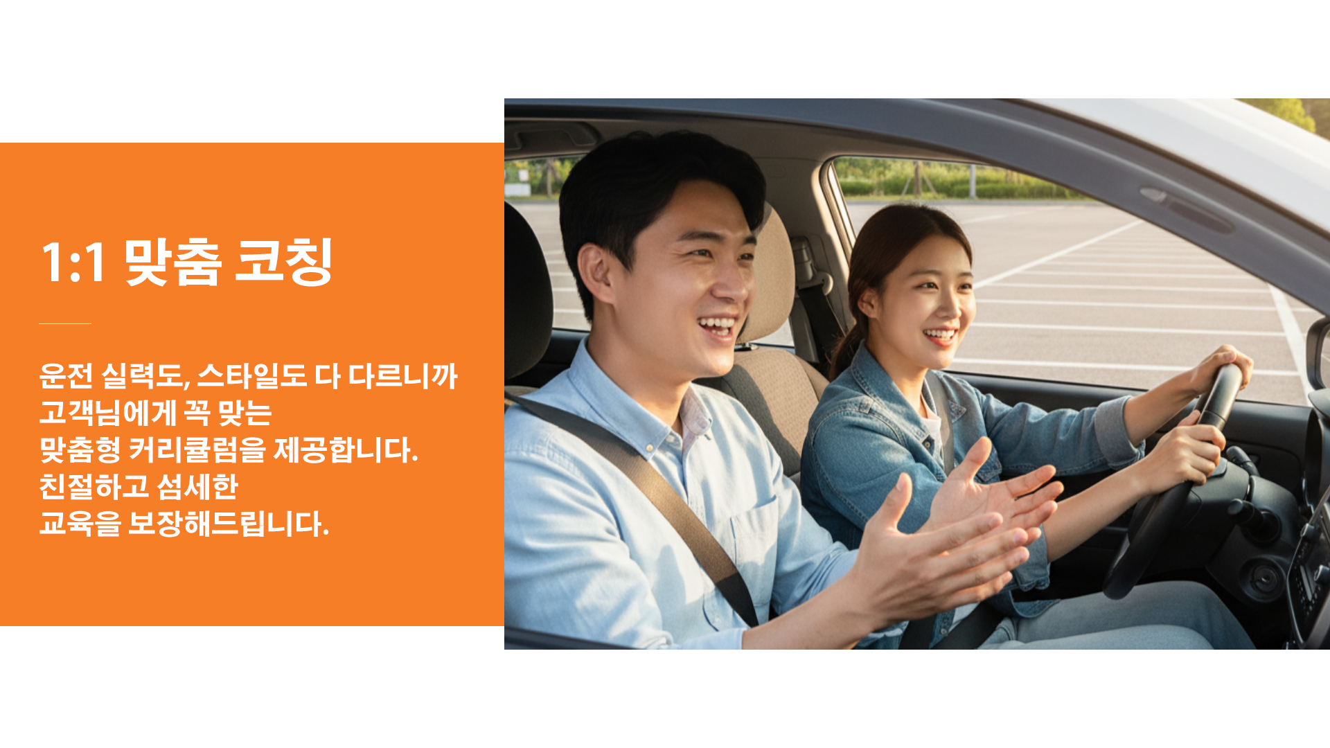 실제 도로 환경에서 1:1 맞춤형 실습으로 진행됩니다. 교차로·골목길·주차 등 실전 주행 중심으로 구성돼요.